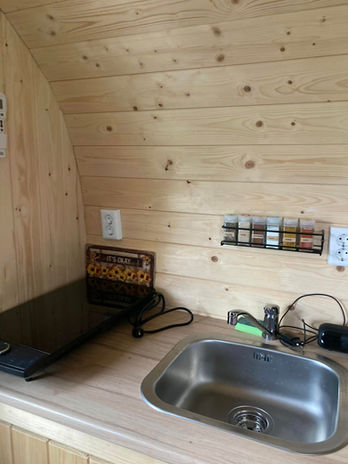 Knusse pipowagen met slaapplaats voor 4 personen, zithoek met tafeltje, zitbanken en opbergruimte, lavabo en aanrecht. Airco en verwarming zijn voorzien.